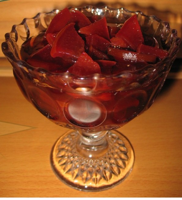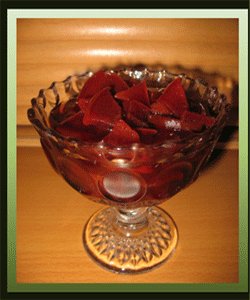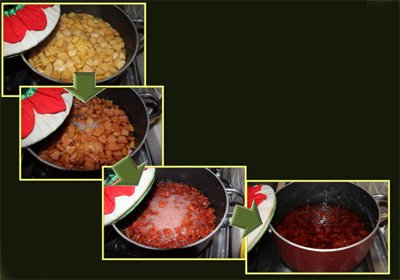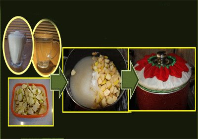 یک کیلو به خرد کرده، یک کیلو شکر (معادل 4 لیوان سرپر)، یک کیلو آب (معادل 4 لیوان)، را در یک قابلمه ریخته، روی شعله متوسط دم میکنیم.