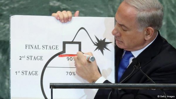 بنیامین نتانیاهو در سخنرانی خود در مجمع عمومی سازمان ملل در سپتامبر ۲۰۱۲ با ارائه تصویری از یک بمب، "خط قرمزی" برای ایران ترسیم کرده بود.