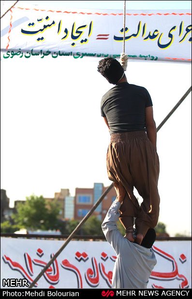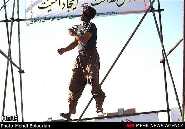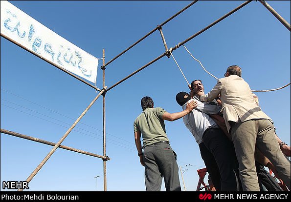 به احتمالِ زیاد، قبل از مراسمِ اعدام خانواده مقتول به مأموران خبر داده که میبخشند اما به گونه ائی که لحظاتی با مرگ دست و پنجه نرم کند، دست بند و پا بند قاتل را به گونه ائی که خودش متوجه نشود قفل نکردهاند، تا در روی زمین است عکس و ال عملش شرطیست و حرکتی نمیکند ، اما وقتی بالا میرود چون در حالِ جان کندن است به خودی خود به تقلا میافتد اگر دست و پا بسته باشد که محکوم با زجراورترین احساس و تسلیم کامل مرگ بدون حرکت جان میدهد دستبند قفل شده مانع از تقلا او میشود اما دست بند و پا بندِ این محکوم در اولین تقلا و دست و پنجه نرم کردن با مرگ باز میشود و مأموران که مترصد موقعیت مناسبند که هم بمیرد و هم نمیرد :) سریع به او کولی داده و از مرگ نجاتش میدهند و چون این موضوعی رسانه ای میشده، جلادان تیپ مدل جوانان کوچه و خیابان را زده اند که باز تدأعی ماموران حکومتی نشود، به امیدِ خدا اندیشه شان مانند مردم شود نه لباسشان ، ضمنا اون قاتلِ عمامه پوش که طبق معمول به نطاقی برای خود فریبی و دیگر فریبی ست.