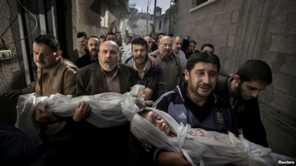 عکس را که نگاه میکنی، انگار صحنهای از یک فیلم سینمایی در برابر چشمانت نقش بسته، تشییع جنازهای در یکی از کوچههای تنگ و تاریک غزه. دیوارهای خاکستری رنگ در دو طرف، و میان آنها، جمعیت عزادار که گویی کنارهم چیده شدهاند. مردان خشمگینی در دوردست دیده میشوند. پیکر دو کودک، به نامهای صُحیب و محمد، را بر دست گرفتهاند و، آن دورتر، پیکر پدرشان، فؤاد حجازی. این سه در اثر اصابت بمب اسرائیل به خانهشان جان باختند.