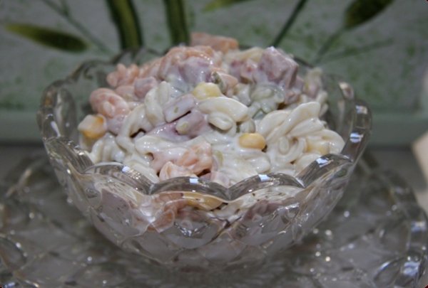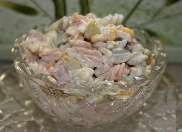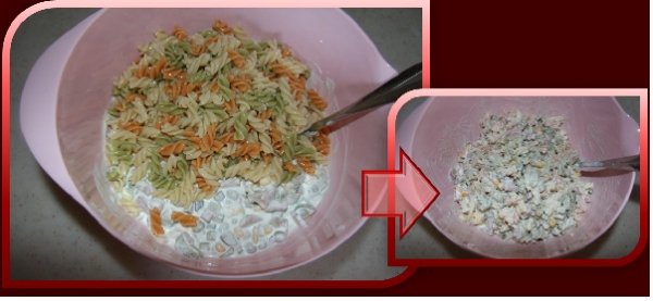 ماکارونی آبکش شده را نیز اضافه کرده، مخلوط می‌کنیم تا سالاد ماکارونی آماده شود.