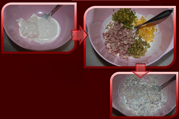 یک لیوان سس و یک لیوان ماست و در صورت دلخواه کمی فلفل را در یک ظرف بزرگ ریخته، هم می‌زنیم. سپس نصف لیوان خیارشور خرد کرده، نصف لیوان کنسرو ذرت، نصف لیوان کنسرو نخودفرنگی و یک لیوان کالباس خرد کرده را به سس اضافه می‌کنیم و هم می‌زنیم.