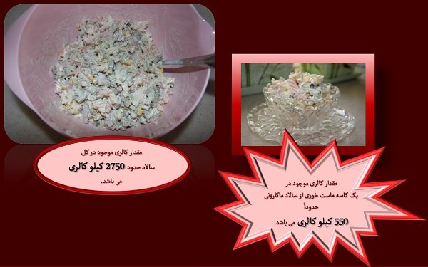 با این مقدار مواد لازم حدود پنج کاسه ماست خوری از ”‌سالاد ماکارونی “ خواهیم داشت.