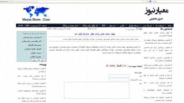 شبکه ایران، ارگان رسانه‌ای دولت جمعه ۲۷ اردیبهشت از فیلترشدن همزمان چهار سایت حامیان اسفندیار رحیم‌مشایی خبر داد. یکی از این سایت‌ها "معیارنیوز" است که همین خبر را قبل از شبکه ایران منتشر کرده بود.