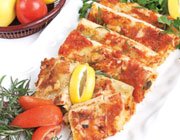 * یک ورقه لازانیا را در سینی قرار میدهیم، مقداری از مواد را روی یک قسمت از لازانیا قرار داده و شروع به لوله کردن مینماییم.