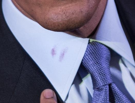 ساعاتی پس از ملاقات با فرماندار نیو جرسی کریس کریستی اوباما با جای روژ لب روی یقه پیراهنش به مهمانی کاخ سفید امد .اوباما این را روشن کرد که ان جای روژلب میشل اوباما نبوده بلکه کار یکی از دوستدارانش در جمعیت است.اوباما به حاضرین در مهمانی ماه میراث اسیایی امریکایی پاسیفیک که میخندیدند گفت:میخواهم از همه بخاطر این استقبال گرم تشکر کنم.یکی از اثار این گرمی جای روژلبیست که روی یقه من است.باید بگویم فکر میکنم متهم را میشناسم!جسیکا سانچز کجایی؟سانچز که یکی از فینالیستهای سال گذشته مسابقه بت امریکایی بود اصلیتی فلیپینی مکزیکی دارد و در این مراسم که اوباما در ان به اصلاح قانون مهاجرت تاکید کرد شرکت کرده بود.اوباما سپس گفت:جسیکا. جسیکانبود.عمه اش بود.کجاست؟عمه خانم ،انجا ! سپس به روژلب روی یقه پیراهن ابی اش اشاره کرد و گفت به این نگاه کن!نگاه کن!میخواهم همه شاهد باشند.نمیخواهم با میشل توی دردسر بیفتم برای همین در مقابل همه صدایت میکنم