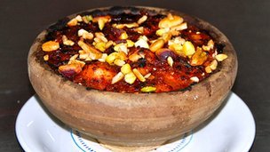 مواد داخل تاوه را گرم نگه دارید و بعد آنها را در یک کاسه سفالی بریزید، و بمدت ۱۰ دقیقه زیر شعله یک منقل روباز بگذارید. حدود یکچهارم فنجان پسته (بجای آن میتوانید از دانه کاج یا بادام هم استفاده کنید) را خرد کنید و کمی حرارت دهید، و بعد آن را روی محتویات کاسه سفالی بریزید. کاسه سفالی را در بشقابی قرار دهید و فورا با برنج یا نان سرو کنید.