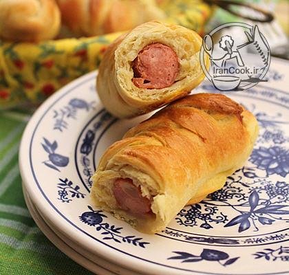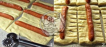 هات داگ ها را کمی در روغن تفت دهید تا طلایی شوند ، تکه هایی از خمیر بردارید و کمی بیشتر از طول هات داگ و به شکل مستطیل پهن کنید سپس هات داگ را در مرکز خمیر بگذارید ، اطراف خمیر را با فاصله های یکسان برش هایی بزنید.