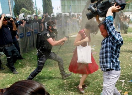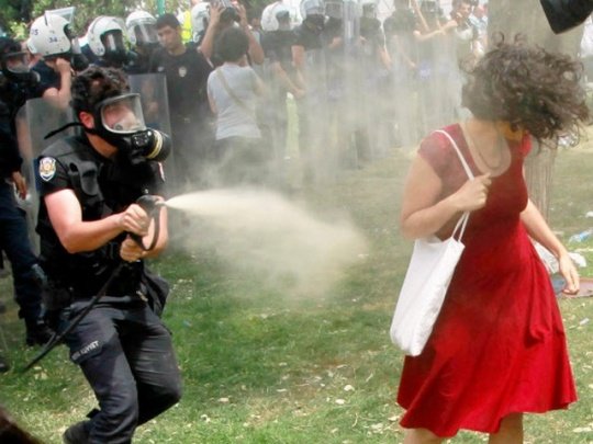 رئیس پلیس شهر استانبول گفته بود که ماموران وی فقط به عنوان آخرین حربه از گاز اشکآور استفاده میکنند. اما این عکسها نشان میدهد که ماموران پلیس به روی یک زن غیرمسلح گاز اشکآور میپاشند و بر این کار سخت اصرار دارند.