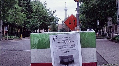 در غیاب صندوقهای رای ایرانی در کانادا، گروهی از ایرانیان مقیم تورنتو یک انتخابات نمادین برگزار کردهاند؛ با صندوقهای رای که خودشان از کارتون و مقوا درست کردهاند و برگههای رای که خودشان چاپ و کپی کردهاند.