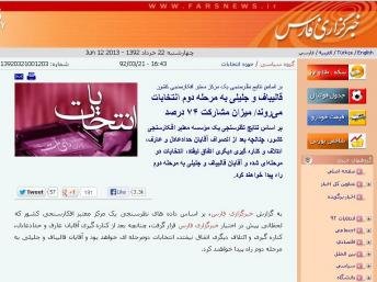 چند روز پیش سایت "کلمه"، نزدیک به منتقدان جمهوری اسلامی نوشت که «خبرگزاری فارس، خبرگزاری وابسته به سپاه پاسداران که چهار سال پیش در این روزها به طور تمام قد از محمود احمدی نژاد کاندیدای ریاست جمهوری حمایت می کرد، در چنین روزی بدون انتشار جزئیاتی ، مطلبی را به عنوان نظرسنجی منتشر کرد که رأی ۶۳ درصدی به احمدی‌نژاد را نشان می داد که گویی زمینه سازی‌ها در قالب نظرسنجی در حال انجام بود تا نتایجی که اعلام می شود باور پذیرتر باشد.»