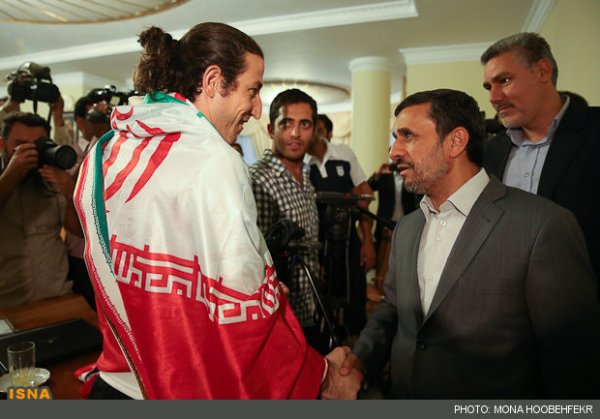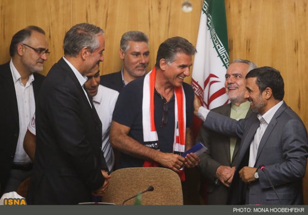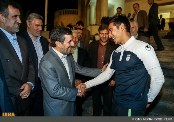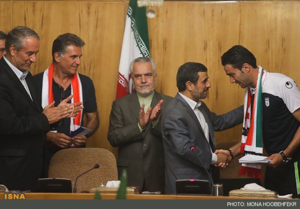 احمدی‌نژاد در هنگام ورود به محل برگزاری این مراسم، با تک‌تک بازیکنان و دست‌اندرکاران تیم ملی دست داد و وقتی آندرانیک تیموریان را دید که پرچم جمهوری اسلامی را به بدن خود بسته بود، به او گفت: از اینکه دست شما شکسته، بسیار ناراحت شدم.