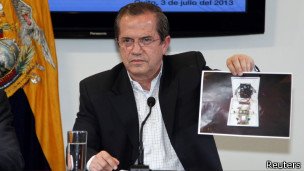 ریکاردو پاتینو وزیر خارجه اکوادور تصویری از میکروفون کشف شده را به خبرنگاران نشان داد