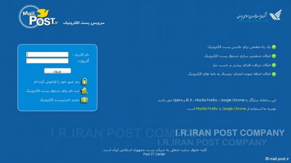 ثبت نام برای دریافت پست الکترونیک (ایمیل) ملی از طریق این وبسایت امکانپذیر است، اما تفاوتهایی بنیادین با ثبت ایمیل در سرویسدهندههای پست الکترونیک جهانی نظیر گوگل و یاهو دارد. برای ثبت پست الکترونیک ملی ایران، کاربر مجبور به ثبت مشخصات خود است و برای کامل شدن این روند نه تنها باید حضوری به دفاتر پستی مراجعه کند بلکه ملزم به پرداخت هزینه است.