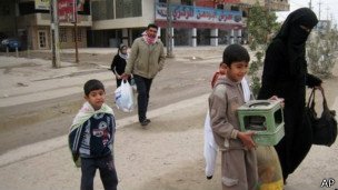 شاهدان عینی به بی بی سی گفته اند هزاران نفر از ساکنان شهر فلوجه عراق در حال فرار از آتش توپخانه و حملات هوایی ارتش کشورند.
