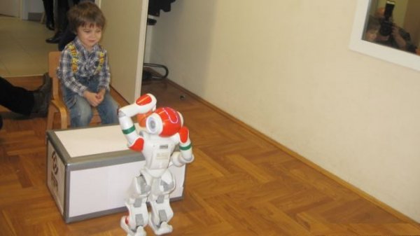 لوکا پسری چهار ساله در مقابل رنه، روباتی که برای تشخیص طیف اختلال اوتیسم کاربرد دارد