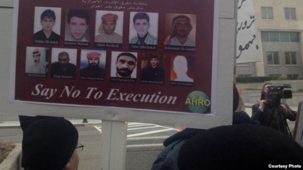اعتراض سال پیش در آمریکا به صدور حکم اعدام برای گروهی از شهروندان عرب ایرانی که هاشم شعبانی (عکس دومی از چپ) و هادی راشدی (سومی از چپ) در میان آنها هستند