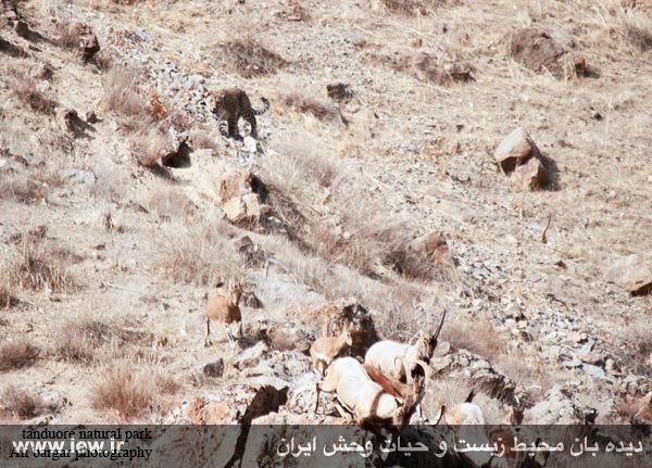 در همین زمان متوجه یک پلنگ شدم که به قصد شکار، گله کل و بزها را تعقیب میکرد و موفق شدم از فاصله حدودا ۵۰ متری از پلنگ و دسته بزهای وحشی در حال فرار عکس بگیرم.