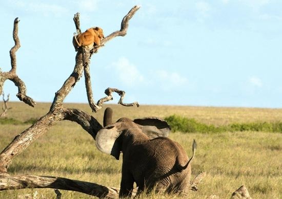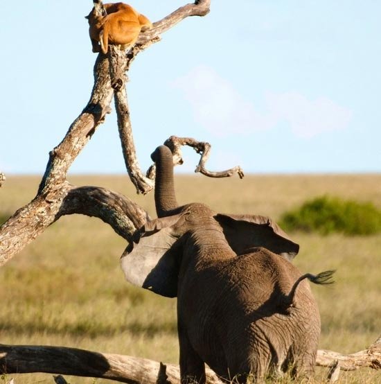 عجب صحنه ای است! شیری در حال لرزیدن روی درخت که از دست یک فیل عصبانی فرار کرده است.