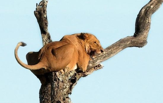خانم اینس 41 ساله اهل سیدنی می گویند دسته ای از شیرها را بعد از شکار مشاهده کردند که ناگهان یکی از آنها از سایرین جدا شده و وارد قلمرو فیل شد. فیل با دیدن شیر در قلمرو خود احساس بدی کرد و دست به تعقیب شیر ماده زد که شیر چاره ای ندید جز اینکه از تنه درختی بالا برود تا جانش در امان بماند.
