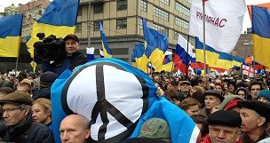 در مقابل مخالفان سیاست کنونی روسیه در اوکراین، در حالی که پرچمهای روسیه و اوکراین را در دست داشتند، "اشغال کریمه" را اقدامی شرمآور خواندند.