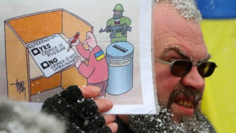 دولت تازه بر سر کار آمده اوکراین میگوید مسکو رسما با اعزام نیرو به کریمه این شبه جزیره را در کنترل و اشغال خود در آورده اما روسیه میگوید نظامیانی که با لباسهای بدون نشان در کریمه مستقر شدهاند نیروهای کریمهای هستند که قصد دفاع از سرزمین خود را دارند.