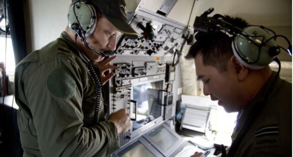 خدمه یکی از هواپیماهای نیروی هوایی استرالیا در حال جستجو برای یافتن نشانهای از هواپیمای پرواز ۳۷۰