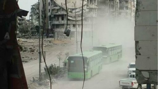 به دنبال توافق میان شورشیان و دولت سوریه که با وساطت سازمان ملل صورت گرفت، اتوبوس‌های حامل پیکارجویان در حال ترک بخش قدیمی شهر حمص هستند.
