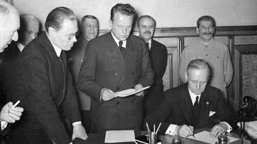 دولت شوروی در اوت سال ۱۹۳۹ معاهده عدم تجاوز متقابل را با دولت آلمان نازی امضا کرد که از جمله شامل تقسیم بخشهایی از اروپا به حوزههای نفوذ دو طرف بود. برخی مورخان غربی گفتهاند که امضای این معاهده به آلمان نازی امکان آن را داد تا بدون نگرانی از امنیت در مرزهای شرقی، توان نظامی خود را بر جنگ در جبهه اروپای غربی متمرکز کند که به تصرف بسیاری از کشورهای این منطقه منجر شد.