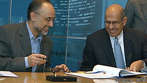 علی اکبر صالحی، نماینده وقت ایران و محمد البرادعی، مدیرکل وقت آژانس در هنگام امضای پروتکل الحاقی در سال ۱۳۸۲