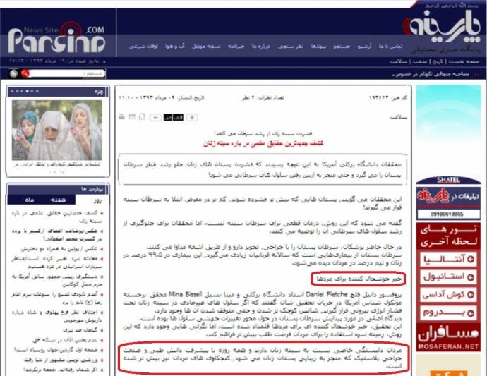 این وبسایتها که به “اصولگرایان” نزدیک هستند و از معروفترین آنها میتوان از «پارسینه» و «اعتدال» نام برد، امروز پنجشنبه (۹ مرداد-۳۱ جولای) گزارشی را با در حالی با عنوان «کشف جدیدترین حقایق علمی در باره سینه زنان» منتشر کردهاند که تحقیق مربوط به آن در دسامبر ۲۰۱۲ (آذر ۱۳۹۱) از سوی دانشگاه کالیفرنیا (برکلی) منتشر شده و در همان زمان در رسانههای انگلیسیزبان بازتاب یافته بود.