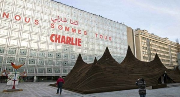 شعار "من شارلی هستم" به زبانهای عربی و فرانسه بر ساختمان موسسه جهان عرب