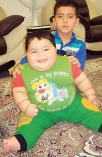 افزایش بیرویه وزن کودک ۱۰ماهه بجنوردی پدر و مادرش را با مشکلات فراوانی روبهرو کرده است.محمد كوچولو درحاليكه فقط 10ماهه است، 35كيلو وزن دارد. هادي كوهي، پدر اين كودك ميگويد: محمد وقتي به دنيا آمد 3 كيلو بود اما وقتي 6ماهش شد 19كيلوگرم وزن داشت. از آنجا كه نگرانش بوديم نزد پزشك رفتيم. يكي از متخصصان گفت احتمالا بهخاطر شير مادر است. براي همين در 6ماهگي او را از شير گرفتيم اما پسرم برخلاف ديگر كودكان اشتهاي عجيبي دارد.