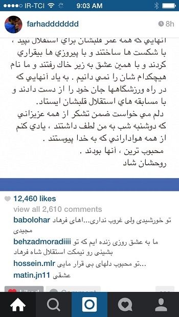 فرهاد مجیدی با انتشار متنی در اینستاگرامش از هواداران این تیم تشکر کرد.
