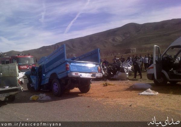 ساعت 3/5بعدازظهر یکشنبه 17 اسفندماه سال جاری بود که سرویس معلمان زن در انحراف به چپ یک نیسان دچار سانحه دلخراشی شد و صحنهای باورنکردنی را در جاده میانه – میاندوآب به تصویر کشید.با مخابره این تصادف خونین به پلیس 110، اورژانس جادهای و تیمهای پزشکی امدادی برای نجات جان حادثهدیدگان وارد عمل شدند و پیکرهای خونین 6 زن و مرد را از میان آهن پارههای خودرو بیرون کشیدند.
