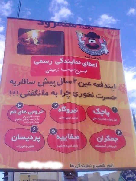 دراوج این برو بیاها ناگهان نام مغازه تغییر کرد. «آقای سیب زمینی» شد «سیب زمینی خوشمزه». ما – که به اقتضای سیب زمینی دوستیمان مشتری دائمی مغازه بودیم- به صاحب مغازه – که به اقتضای خویشی با یکی از دوستان به هم نزدیک شده بودیم- اعتراض کردیم که چرا اسم آن بامزگی را به این اسم به این بیمزگی تغییر داده است. درآمد که از اماکن گیر سفت و سخت دادهاند که «آقای سیب زمینی» کنایه به احمدینژاد است و باید تغییر کند. که کرد.