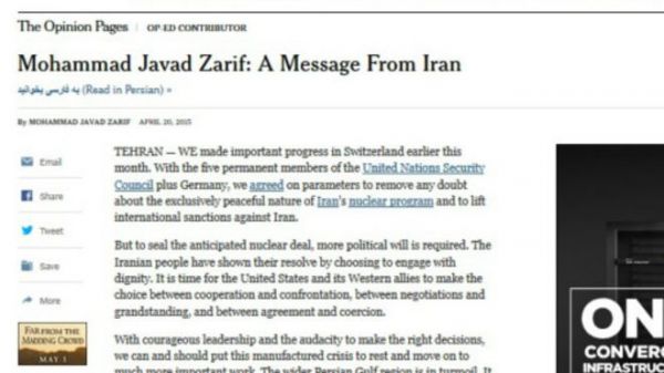 یک روز پیش از این محمد جواد ظریف، وزیر خارجه ایران با انتشار مقاله ای در بخش دیدگاه های روزنامه نیویورک تایمز، اعلام کرده بود که ایران برای "تعامل سازنده بسیار فراتر از موضوع اتمی" آمادگی دارد و مایل است برای حل مشکلات منطقه خلیج فارس و اطراف آن با صاحبان منافع در منطقه و "بر سر مسائل مهم تر" همکاری کند.