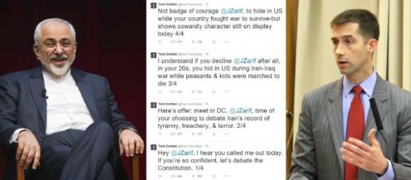سناتور کاتن که در فاصلهی سالهای ۲۰۰۵ تا ۲۰۰۹ به عنوان سروان نیروی زمینی امریکا در عراق و افغانستان خدمت کرده، سپس کنایهای به گذشتهی ظریف زده و ادامه داده: «البته رد این پیشنهاد، بعد از آنچه که در دههی بیست زندگیات انجام دادی، برایم قابل درک است. وقتی در جریان جنگ ایران و عراق، در امریکا پنهان شدی تا روستاییان و کودکان برای کشته شدن به صف شوند.»