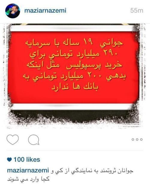 پرسپولیس یک مشتری جدید پیدا کرد؛ جوانی که فقط 19 سال سن دارد.به گزارش خبرگزاری خبرآنلاین؛ رئیس روابط عمومی وزارت ورزش از طریق صفحه اینستاگرام خود خبر داده که پرسپولیس یک مشتری جدید پیدا کرده، مشتری که فقط 19 سال سن دارد. ناظمی در اینستاگرام خود نوشت: «جوانی 19 ساله با سرمایه 290 میلیارد تومانی برای خرید پرسپولیس. مثل اینکه بدهی 200 میلیارد تومانی به بانک ها ندارد. جوانان ثروتمند به نمایندگی از کی و کجا وارد میشوند؟»