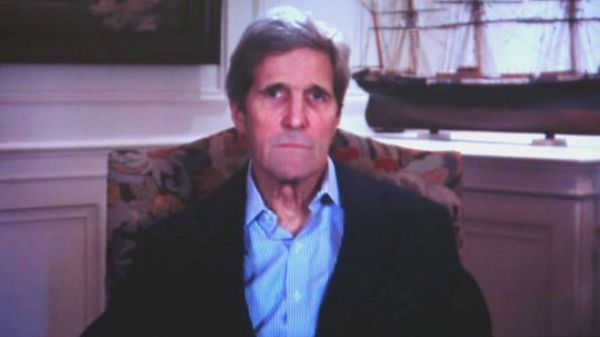آقای کری این سخنان را از طریق ارتباط تصویری بین منزلش در بوستون با وزارت خارجه در شهر واشنگتن بیان کرد.