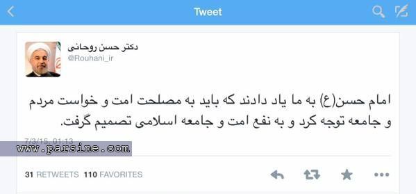 حسن روحانی رییس جمهور در توئیت جدید خود نوشت: امام حسن به ما یاد دادند که باید به مصلحت امت و خواست مردم و جامعه توجه کرد و به نفع امت و جامعه اسلامی تصمیم گرفت.
