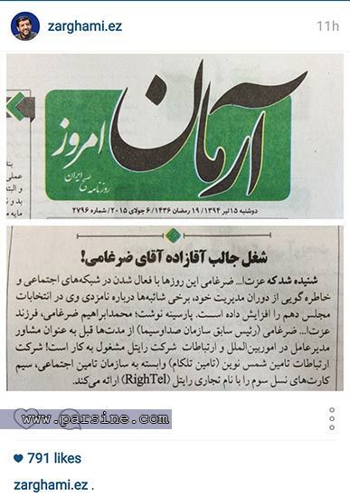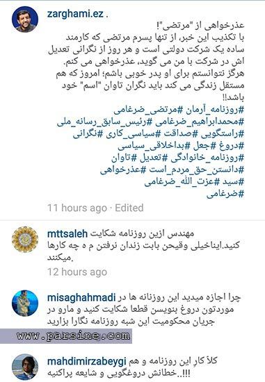 به گزارش پارسینه، پس از درج خبر شغل جالب آقازاده آقای ضرغامی در پارسینه، مهندس ضرغامی در واکنش به این خبر مطلبی در صفحه شخصی شان در اینستاگرام قرار دادند که با واکنش های متفاوتی روبرو شد که در ادامه می خوانید:عذرخواهی از "مرتضی"!
