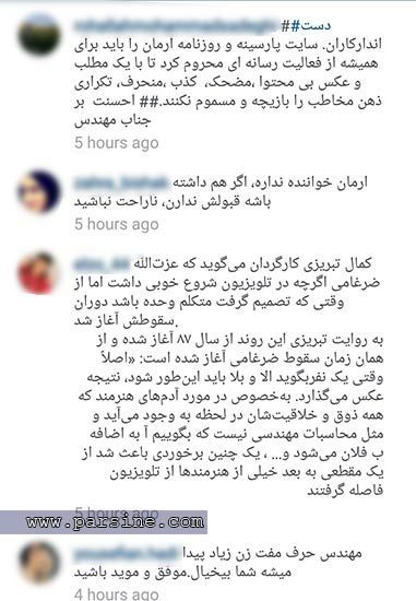 - دست اندرکاران سایت پارسینه و روزنامه آرمان را باید برای همیشه از فعالیت رسانه ای محروم کرد تا با یک مطلب و عکس بی محتوا، مضحک، کذب، منحرف، تکراری ذهن مخاطب را بازیچه و مسموم نکنند. احسنت بر جناب مهندس