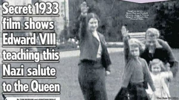 صفحه اول روزنامه سان: "فیلم مخفی از سال ۱۹۳۳ ادوارد هشتم را در حال آموزش سلام نازی به ملکه نشان میدهد."دربار بریتانیا از انتشار تصاویر مربوط به کودکی ملکه الیزابت دوم که او را در حال ادای سلام نازی نشان میدهد ابراز ناراحتی کرده است.روزنامه "سان" در صفحه نخست خود تصویری از یک فیلم قدیمی متعلق به سال ۱۹۳۳ را منتشر کرده که در آن ملکه کنونی بریتانیا، هنگامی که حدود هفت سال داشته، با دست راستش سلام نازی میدهد.