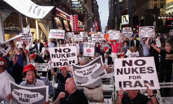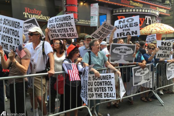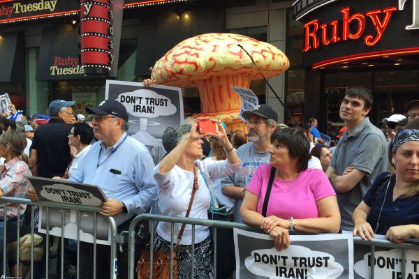 هزاران نفر از مخالفان توافق هسته ای بعد از ظهر چهارشنبه (به وقت نیویورک) در میدان تایمز این شهر گرد هم آمده و با حمل پلاکاردهایی علیه توافق هسته ای با ایران شعار سر دادند. بیشتر مشارکت کنندگان در این تظاهرات از اعضا و هواداران لابی های طرفدار اسراییل در نیویورک بودند.به گزارش عصرایران به نقل از خبرگزاری ها، شرکت کنندگان در این تجمع گفتند که با "ایران هسته ای" مخالف اند و از کنگره آمریکا خواستند با متن توافق هسته ای ایران و گروه 1+5 مخالفت کند زیرا به گفته آنها این توافق، تهدید صریحی برای امنیت جهان و اسرائیل است.