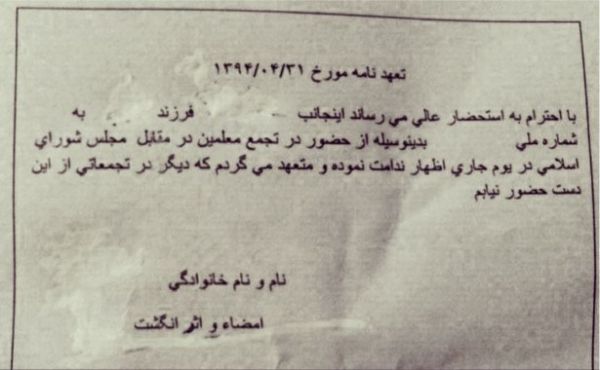 تصویر تعهدنامه معلمان دستگیرشده در مقابل مجلس شورای اسلامی
