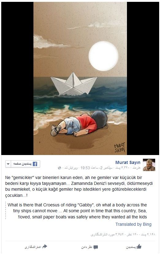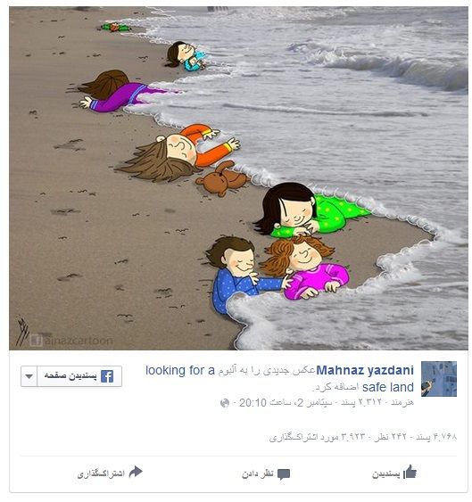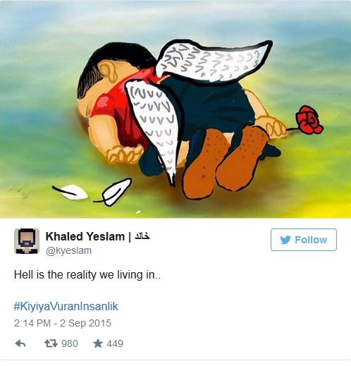 عکس این فرشته کوچولو که دنیا را شوکه کرده حتی چشمهای کور دنیا را بینا کرده،تا حالا نزدیک به چند صد هزار کودک در جنگها و مهاجرت و اسارت کشته شدن ولی دنیا خاموش بود تو راحت بخواب که نامت همیشه سنبلی از مظلومیت بچهها در جهان ماندنیست.ولی پدرت هم خیلی بی تدبیر و بی مسئولیت بوده که تو و مادرت و برادرت را بدون هیچ لباس و جلیقه یی سوار قایق کرده و به سفر بی برگشت فرستاد.