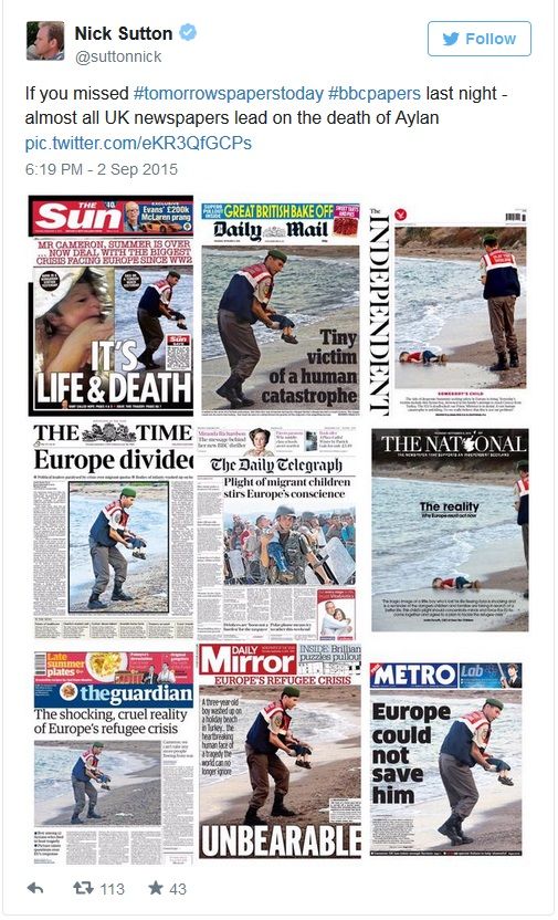 تصویر تن بیجان کودک سوری بر صفحه اول روزنامهها