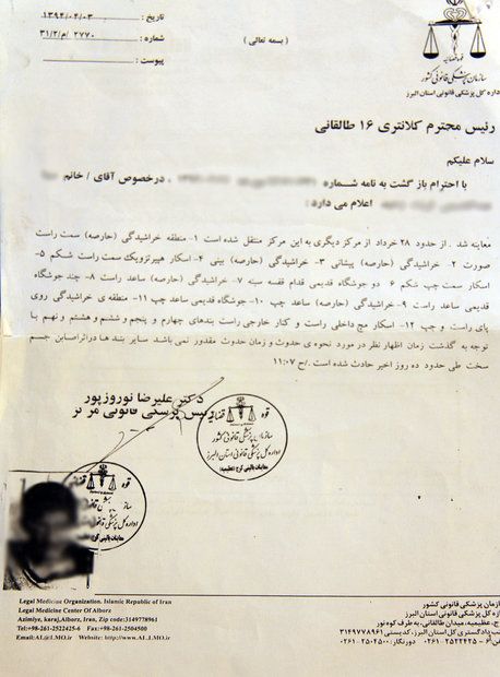 این خبرگزاری همچنین بدون ذکر نام، تصویر گزارش سازمان پزشکی استان البرز درباره «اصابت جسم سخت» و چندین مورد «خراشیدگی» در بدن یکی از این معلولان را منتشر کرده است.