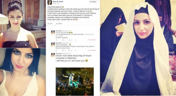“رعنا حربی” خبرنگار روزنامه‌ی “الاخبار” نزدیک به سازمان شبه‌نظامی “حزب‌الله” لبنان، شام‌گاه شنبه (۲ ژانویه-۱۲ دی) تصویری را در توییترش منتشر کرد و در توضیح آن نوشت: «مرد ایرانی، پرچم عربستان را از کنسول‌گری این کشور در مشهد پایین کشیده است. پیدایت می‌کنم و با تو ازدواج می‌کنم (شکلک اشک شوق).»